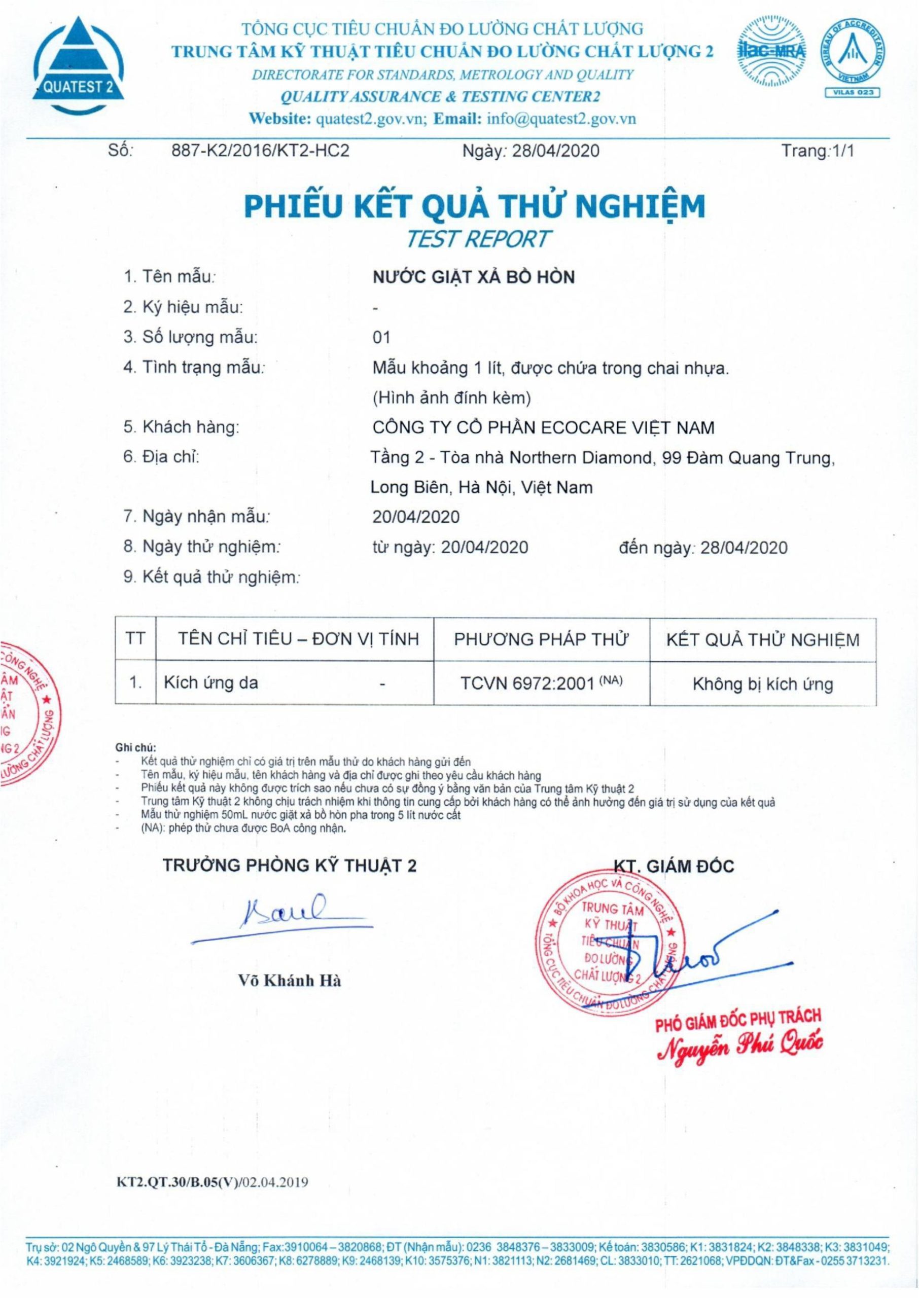 ECOCARE – QUATEST 1: Kết quả thử nghiệm của Trung tâm kỹ thuật TCĐLCL 1