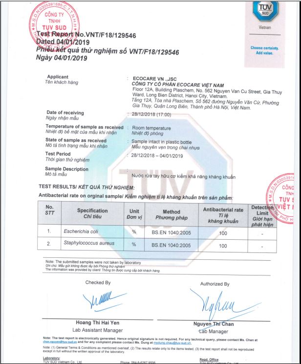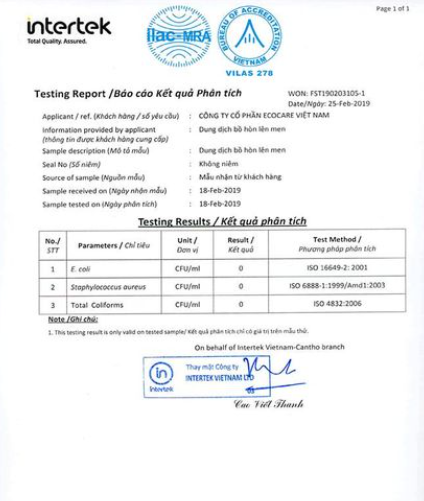 Kiểm định của Trung tâm Kỹ thuật Tiêu chuẩn Đo lường Chất lượng 2 (QUATEST 2) giành cho sản phẩm “Nước giặt bồ hòn Ecocare” chứng nhận độ an toàn giành cho da, không kích ứng da của các thành phần có trong nước giặt.